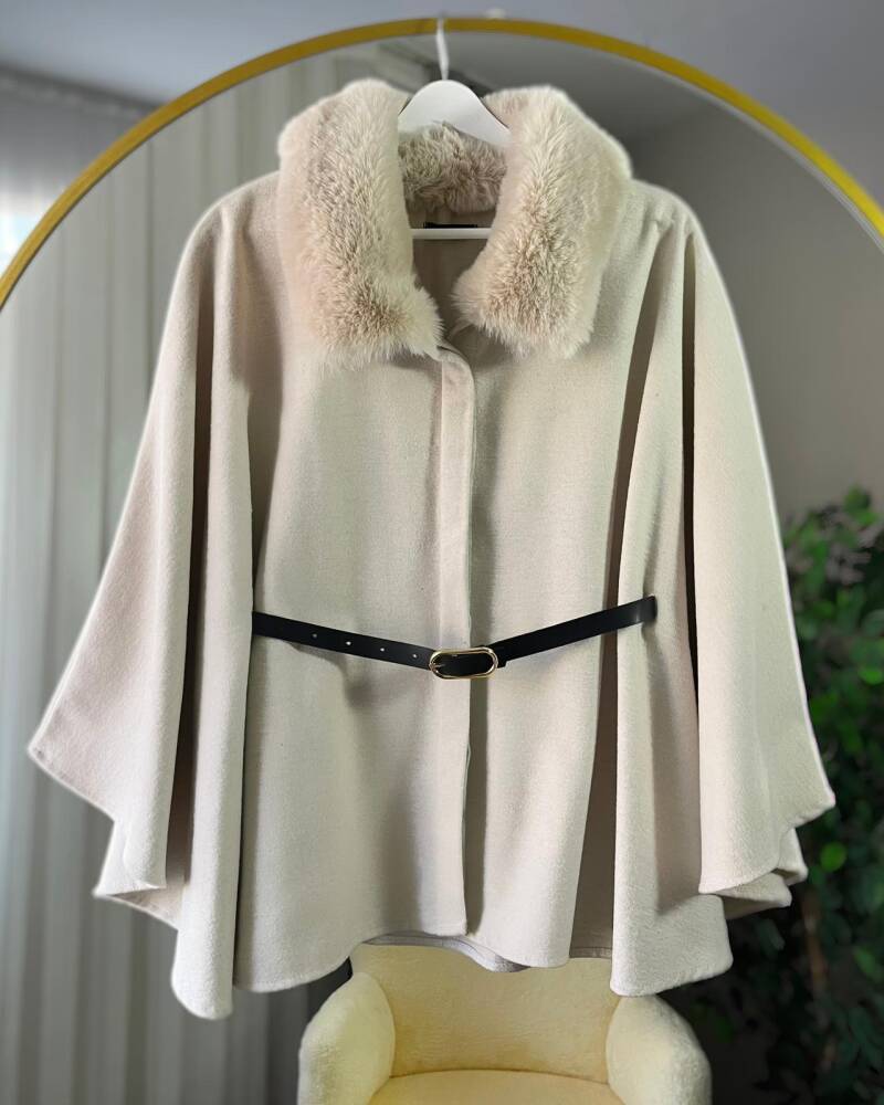 LUNA KÜRKLÜ KEMERLİ KAŞE PANÇO 4006-02-BEJ