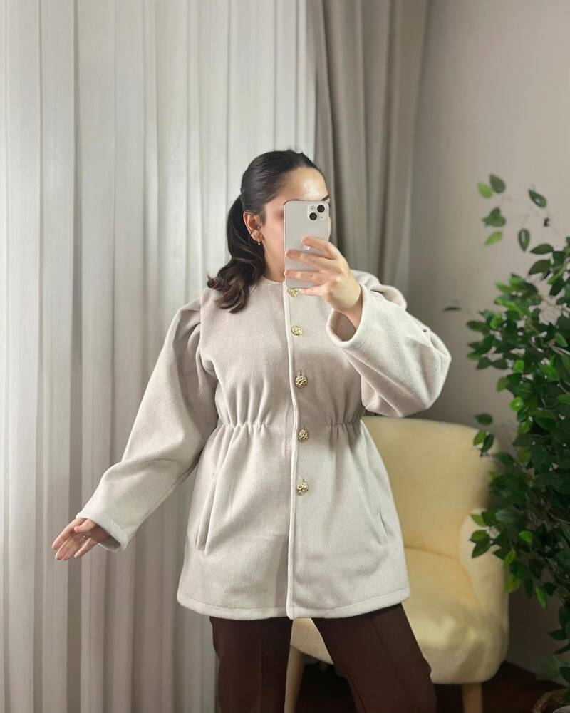 PARE ÖNÜ DÜĞMELİ BELİ BÜZGÜLÜ CEKET KAP 4006-07-EKRU - 1PARE ÖNÜ DÜĞMELİ BELİ BÜZGÜLÜ CEKET KAP 4006-07-EKRU - 2