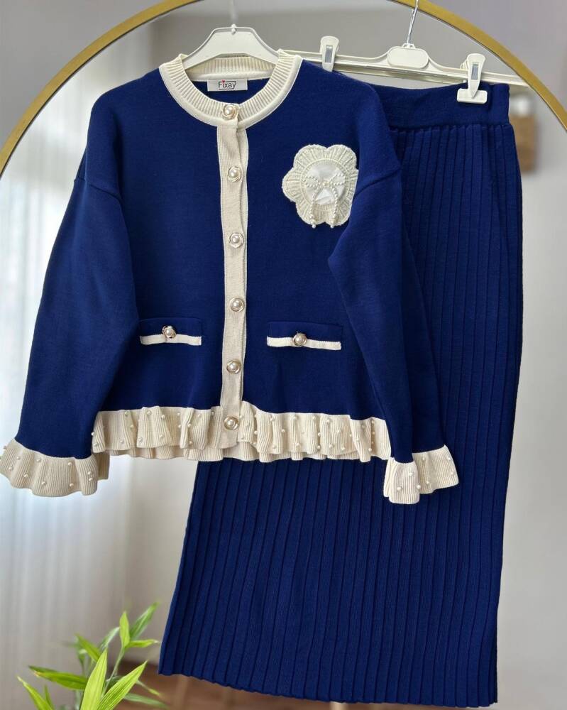 SERVA PAPATYA İŞLEMELİ İNCİ DETAYLI TRİKO ETEKLİ TAKIM 1007-03-LACİVERT